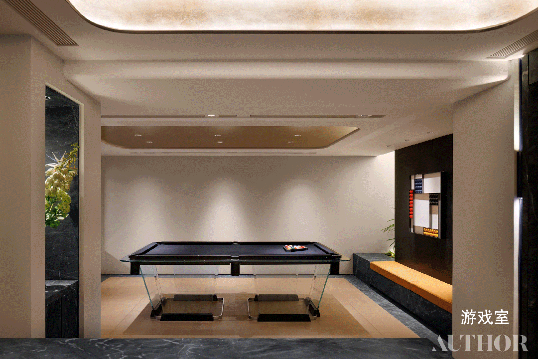 空间包含双开门+玄关+男女双衣帽间+迷你吧+卫生间+打扮台书房,打制“早咖晚酒”潮水糊口体例。采用巴西利亚石材,